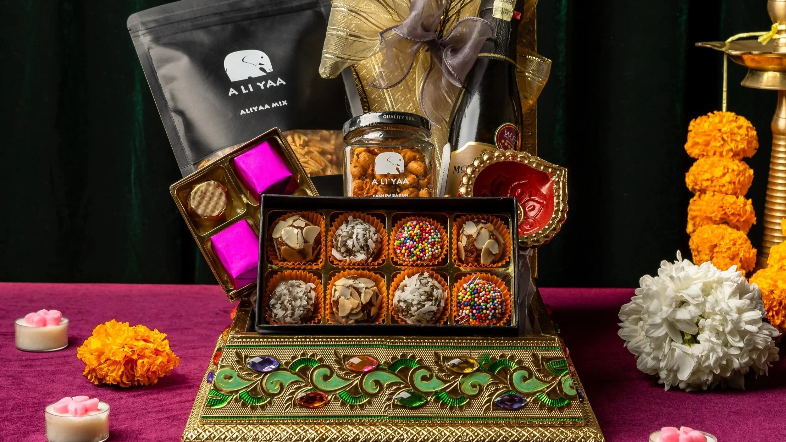 Inside you’ll find our signature cashew badun, festive murukku, 200 ml Montelvini Prosecco, assorted chocolates, and two varieties of laddu.